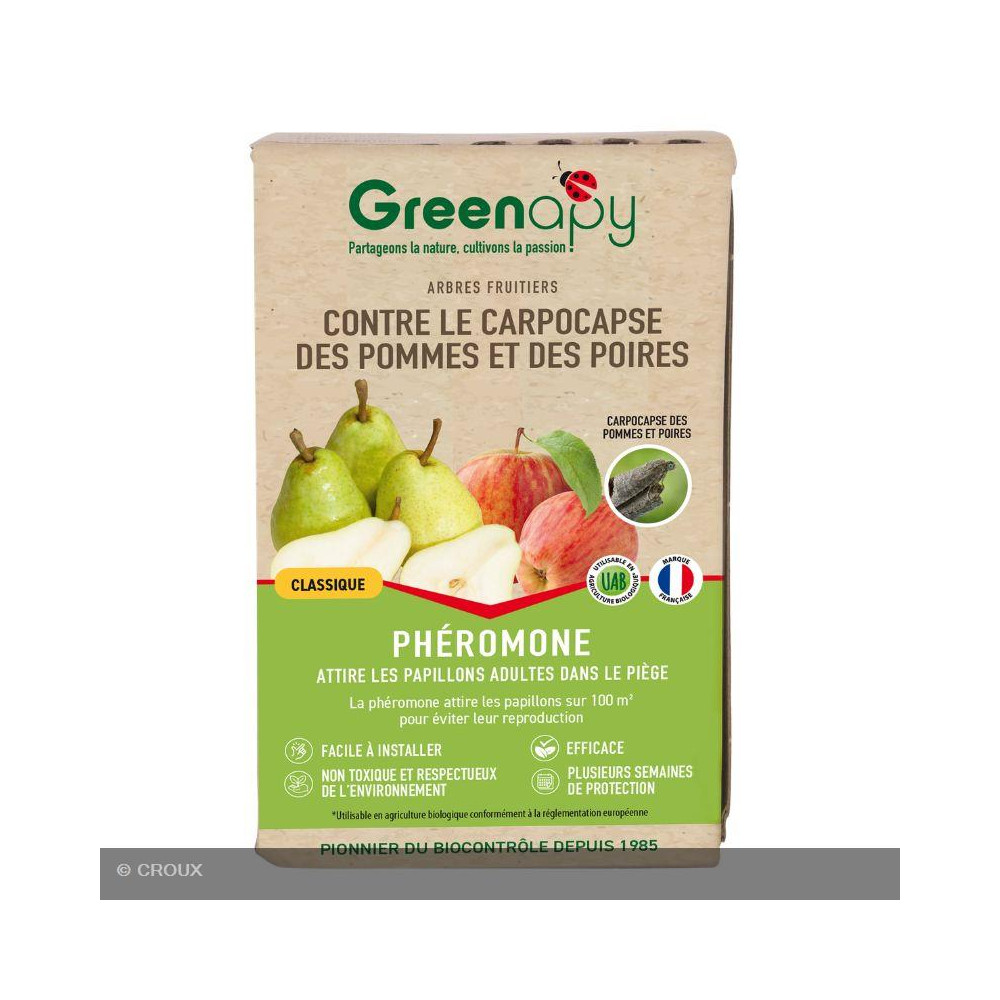 Phéromone ou attractif destiné au piégeage du carpocapse des pommes et des poires, responsable des fruits véreux. Utilisé avec un piège adapté, il attire les papillons adultes pour réduire la population et limiter la reproduction, contribuant ainsi à protéger les récoltes.