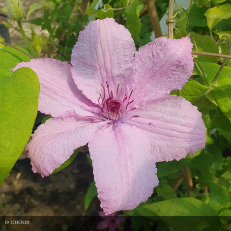 Grimpante caduque au port compact, s’enroulant sur tout support à l’aide de ses vrilles, au feuillage vert vif, à croissance modérée. Sa belle floraison printanière remontante, en grandes fleurs étoilées roses habillera gracieusement treille et pergola. Rustique, privilégier une exposition soleil mi-ombre, tolérant tous types de sols.