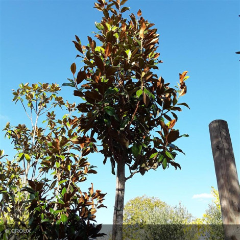 Arbre persistant au port pyramidal étalé, au grand feuillage vert luisant à revers brun, à croissance lente. Floraison estivale en grandes fleurs blanches parfumées, suivie de fruits coniques rouges. Idéal en isolé pour parcs et grands jardins. Privilégier une exposition soleil à mi-ombre. Rustique, mais exigeant un sol enrichi en terre de bruyère.