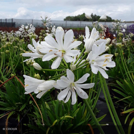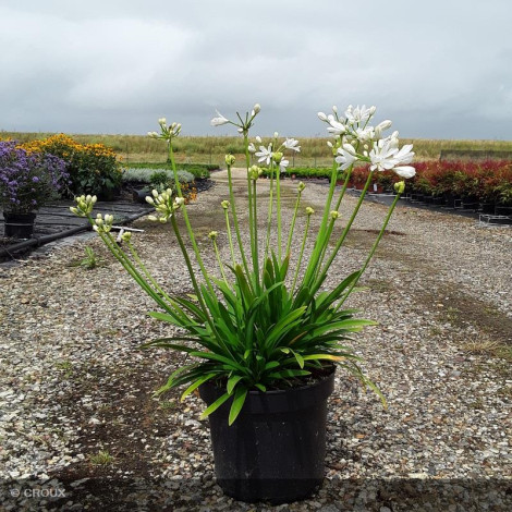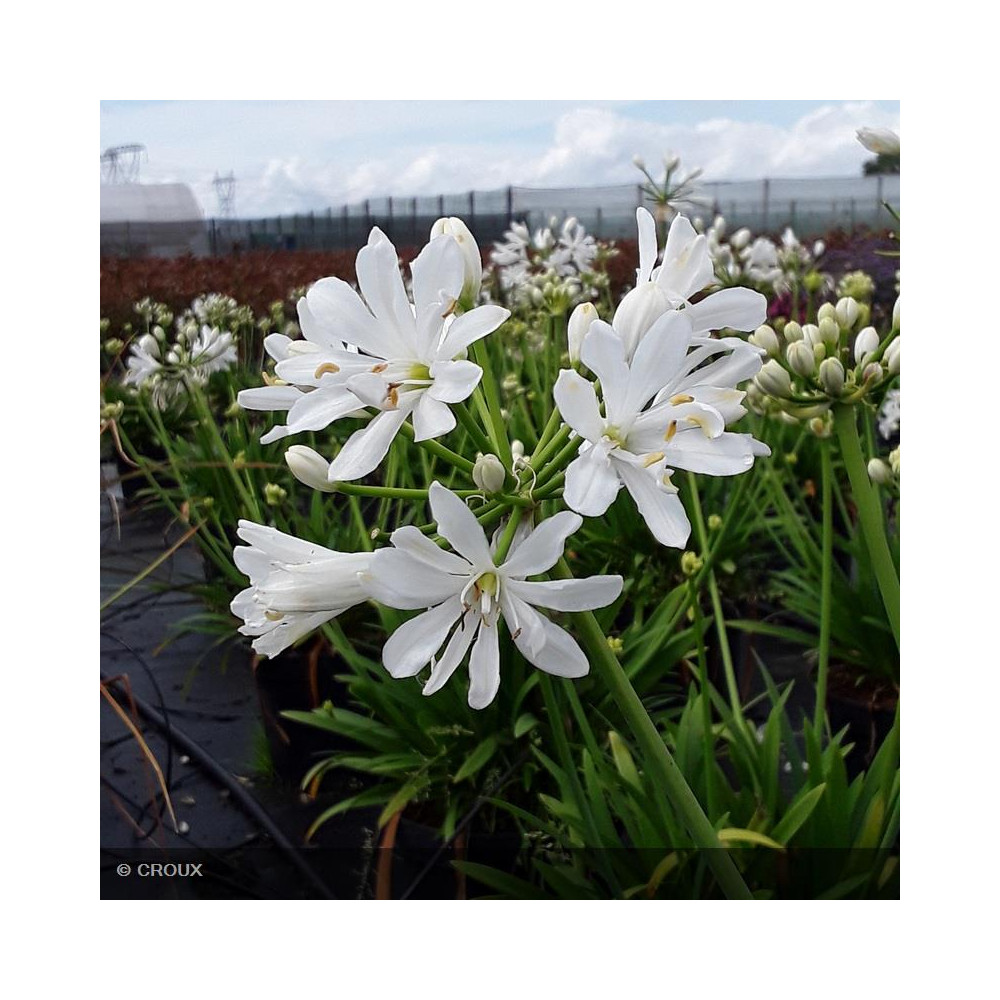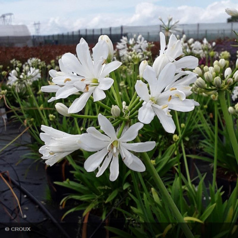Vivace rhizomateuse semi-persistante, au feuillage vert rubané, à croissance modérée. Abondante floraison estivale en ombelles sphériques blanc pur. Très graphique, cette variété à petit développement sera parfaite en pot ou en bordure de massif fleuri. Sensible aux grands froids, privilégier une exposition ensoleillée et un sol bien drainé.