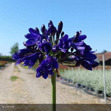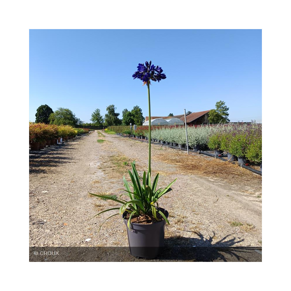 Vivace rhizomateuse caduque, au feuillage vert rubané, à croissance modérée. Spectaculaire floraison remontante, en ombelles sphériques bleu-violet intense. Très graphique, elle sera parfaite en massif fleuri ou en pot. Sensible au froid, privilégier une exposition ensoleillée et un sol bien drainé.